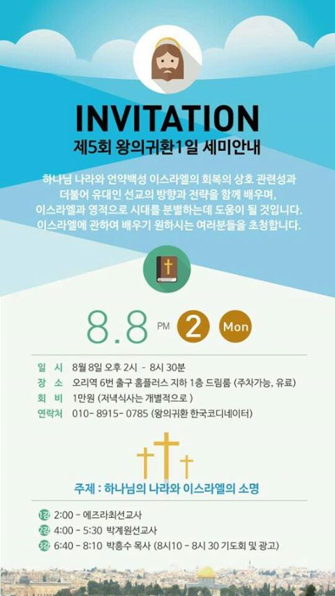 왕의 귀환 팰로십에서는 1년에 두번 분당에서 정기 세미나를 합니다. 8일 오늘, 2시- 8: 30까지, 시간과 여건이 가능하시다면 꼭 참석해 주세요. 특별히 요번 1일 세미나에는 런던 유대인들 집중거주지역에서 유대인들을 타켓으로 선교하는 교회에 시무하시며 늘 거리에 나가셔서 유대인들에게 전도하시는 박계원 선교사님께서 강사팀에 조인하셔서 선교 현장에서의 경험과 깨우침뿐 아니라 이를 통하여 단련된 말씀을 배울수 있는 기회가 되었습니다.