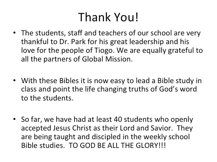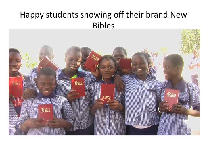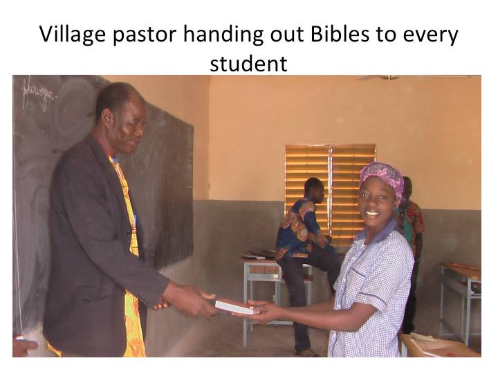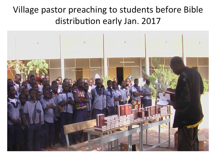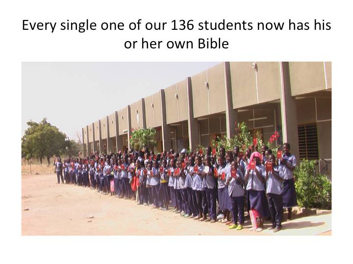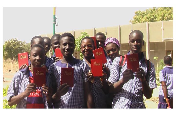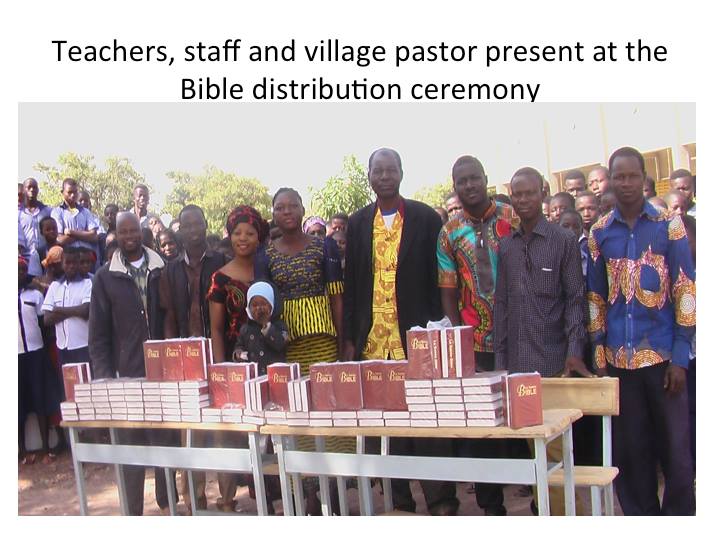 잠시 로스앤젤레스 어머님댁을 방문하게 되었는데 시어머님께서 그간 정성스레 모아오신 3700불을 주시면서 부르기나 파소 티오고 중고교에 새로 들어오게 되는 학생들을 위하여 불란서 성경책을 사주라고 하셨습니다. 작년에 44명에게 불란서 성경을 사주셨는데 올해에 인원이 많이 늘어 120명( 보내온 편지에 의하면 136명이 되었다고 하네요) 이 되었기 때문입니다. 또 학생들이 찬양할 수 있도록 악기를 준비하도록 하라고 하셨습니다. 마침 학교 교장이며 현지인 동역자인 파우형제가 결혼을 앞두고 있어서 그 가정을 위해서도 기쁜 선물을 보낼수 있었습니다. 참 감사합니다.